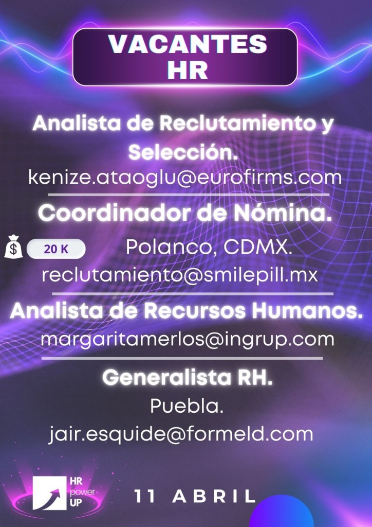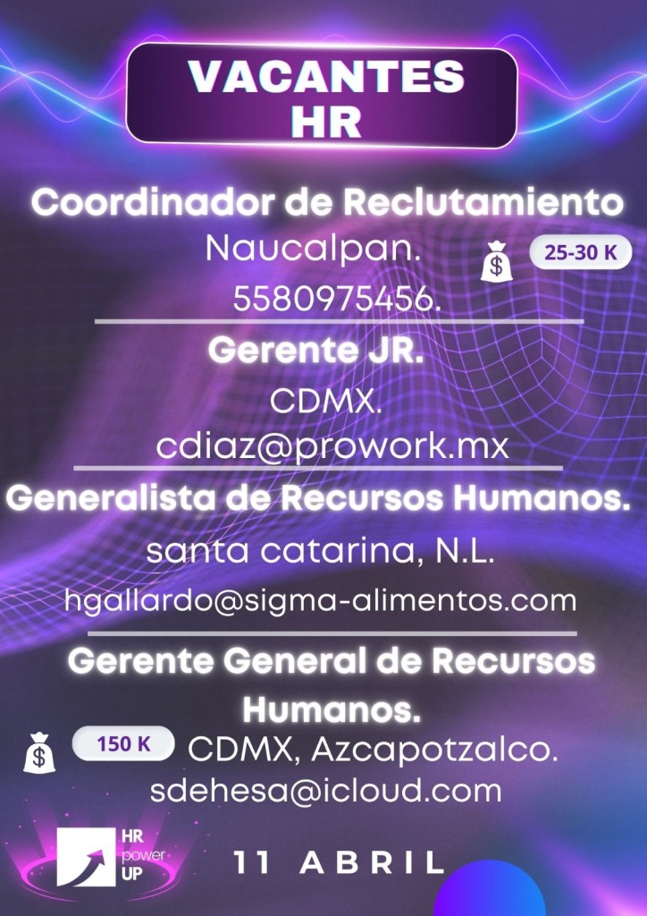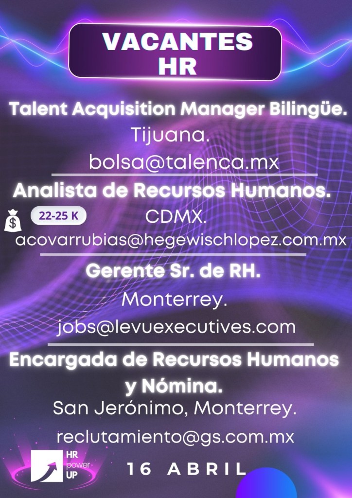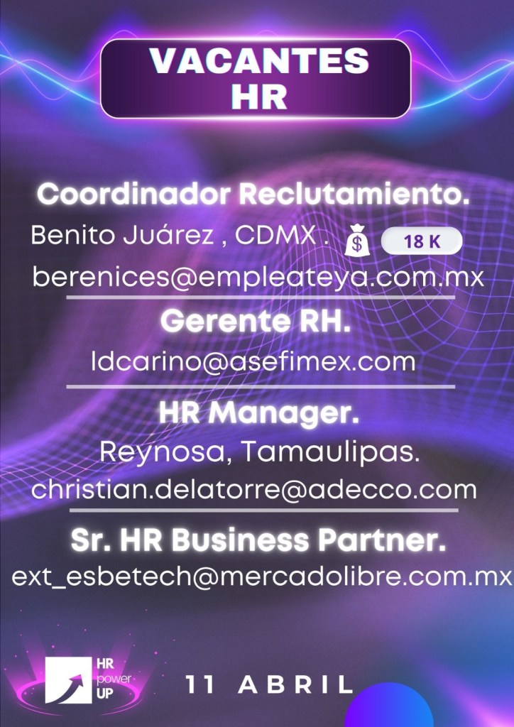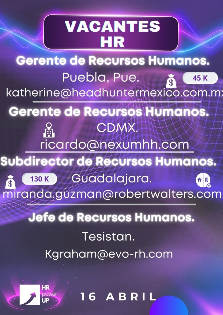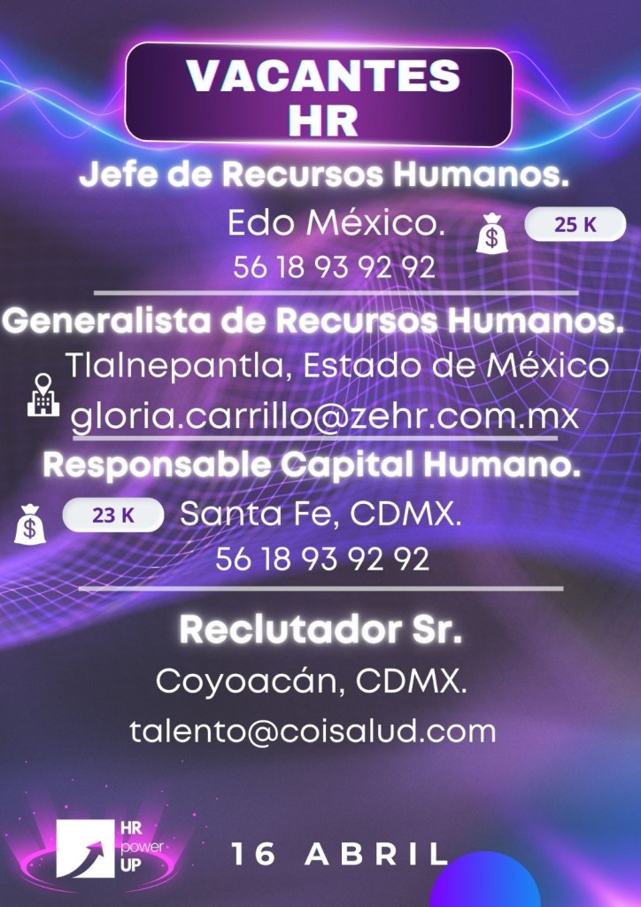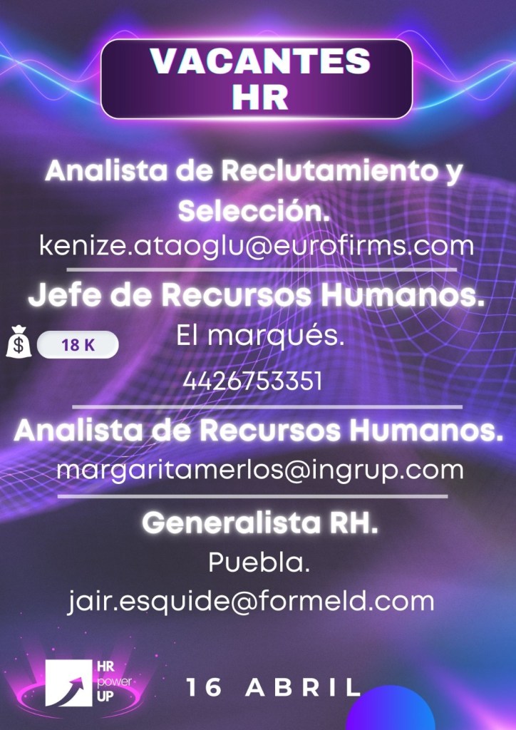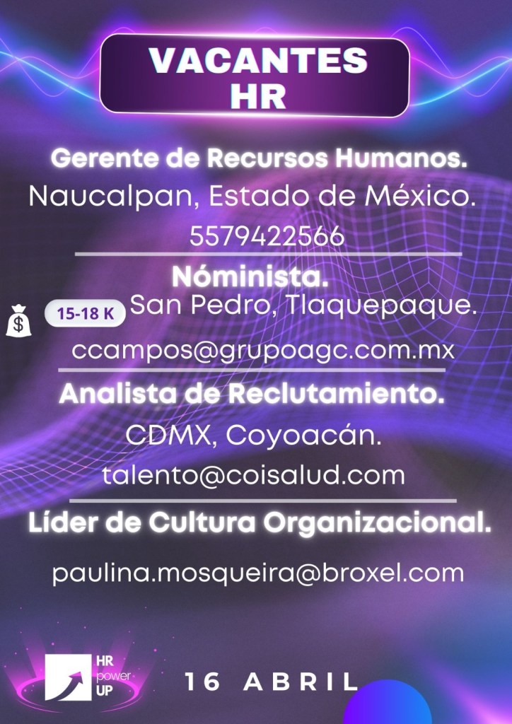 Como apoyo a la comunidad y con el propósito de difundir nuevas oportunidades de empleo, estaremos compartiendo vacantes de HRPowerUp! y más lugares que deseen apoyar. A continuación te compartimos las imágenes que han publicado para que puedas contactarles (toca o da clic en la imagen para hacerla más grande).