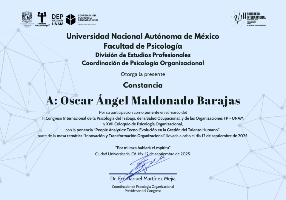 Soy psicólogo, consultor organizacional y fundador de PsycoPyme®, con experiencia acompañando a empresas, líderes y profesionales en procesos de Recursos Humanos, bienestar organizacional, People Analytics y transformación digital. Mi enfoque combina psicología, estrategia y tecnología, ayudando a las personas a entender qué está pasando, tomar mejores decisiones y definir caminos claros de acción, sin soluciones genéricas ni recetas rígidas.