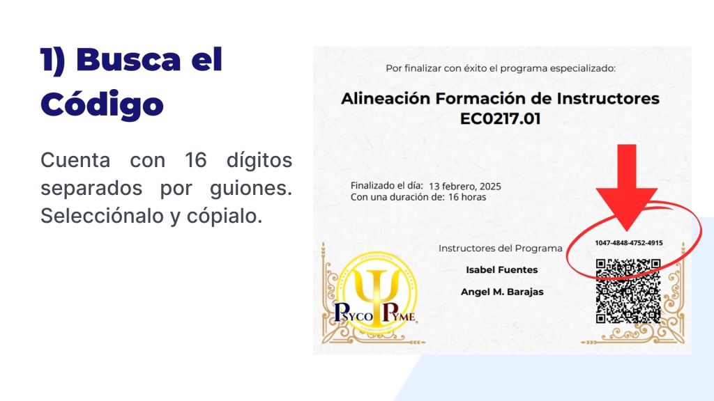 Aquí podrás validar los Certificados Emitidos por PsycoPyme Academy. Introduce el Código del Certificado (normalmente está cerca del Código QR de la constancia o certificado y cuenta con 16 dígitos separados por guiones). Al buscarlo, da doble clic abajo del buscador (puede que las letras estén en blanco y no sean perceptibles a simple vista).